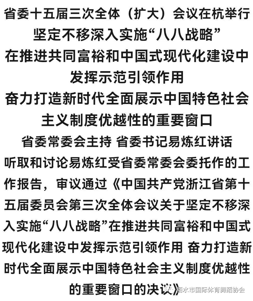 会议坚持以习近平新时代中国特色社会主义思想为指导,深入学习贯彻党的二十大精神,全面学习贯彻习近平总书记重要指示精神,听取和讨论易炼红受省委常委会委托作的工作报告,审议通过《中国共产党浙江省第十五届委员会第三次全体会议关于坚定不移深入实施“八八战略”在推进共同富裕和中国式现代化建设中发挥示范引领作用 奋力打造新时代全面展示中国特色社会主义制度优越性的重要窗口的决议》。会议结束时,易炼红就贯彻落实全会精神、做好当前工作作了讲话。