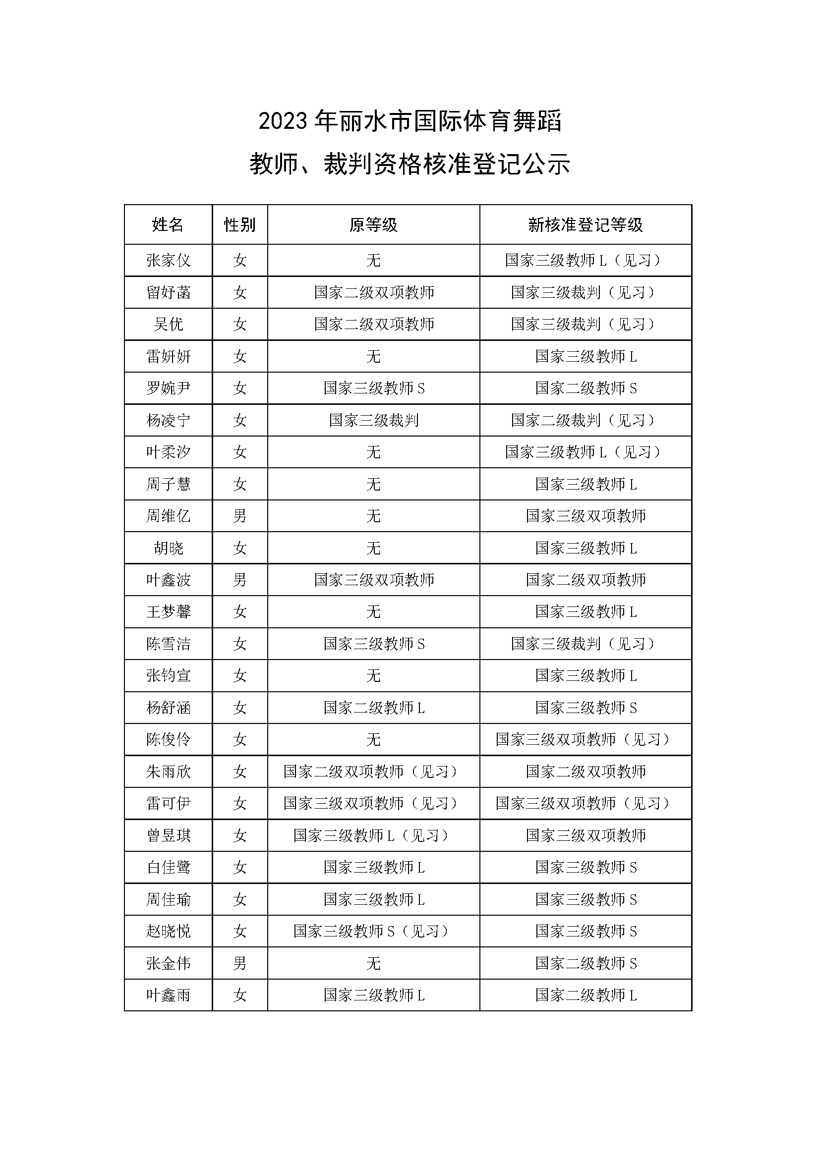 2023年丽水市国际体育舞蹈教师、裁判资格核准登记公示
