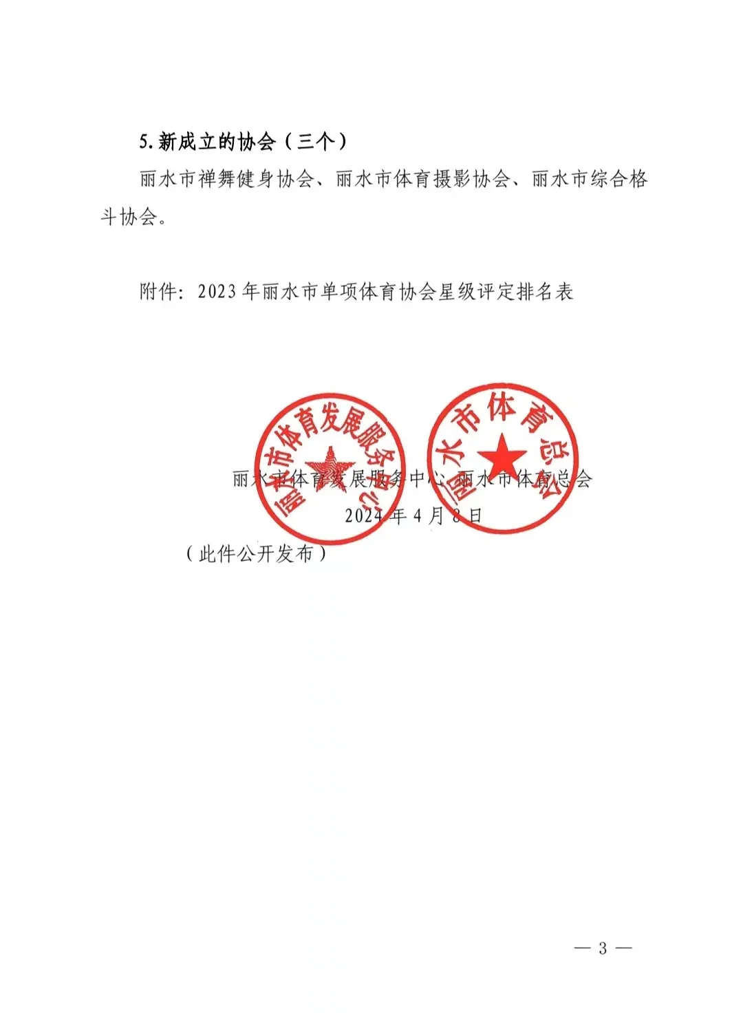 喜报 丨市国际体育舞蹈协会连续四年获评“五星级体育协会” 发表评论 / 协会新闻 / 作者: 丽水市国际体育舞蹈协会 在市体育发展服务中心与市体育总会的悉心指导下,丽水市国际体育舞蹈协会全体会员及广大体育舞蹈爱好者团结一致,共同奋进,通过持续不懈的努力及高效推动,协会各项工作取得了显著成果,2023年度再次荣获“五星级体育协会”的荣誉称号。这一成就凸显了协会全体会员及爱好者们的辛勤付出,同时亦展现了市体育发展服务中心与市体育总会对本协会工作的高度重视与精准指导。 市国际体育舞蹈协会陈家民会长代表市协会上台领奖(左四)