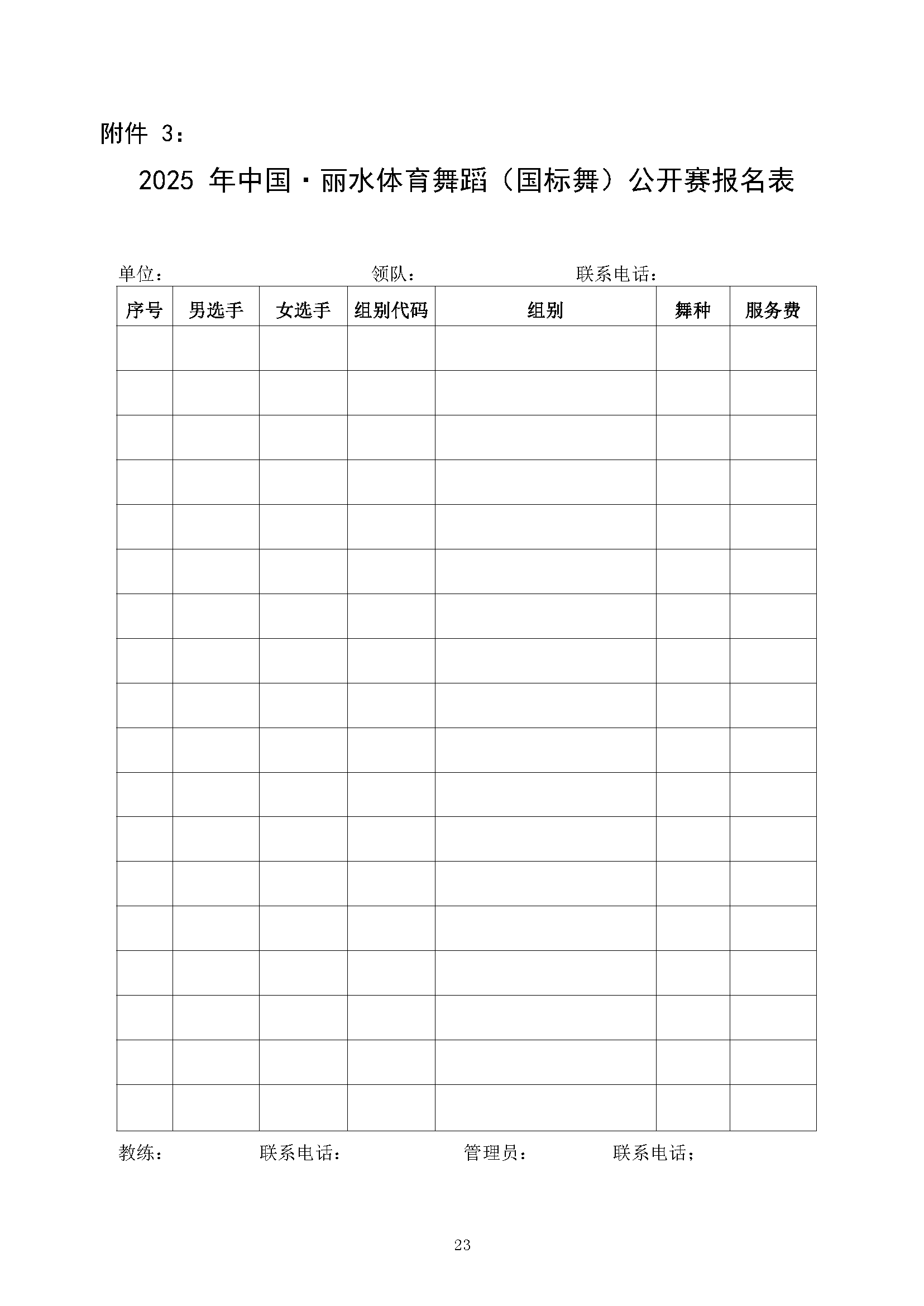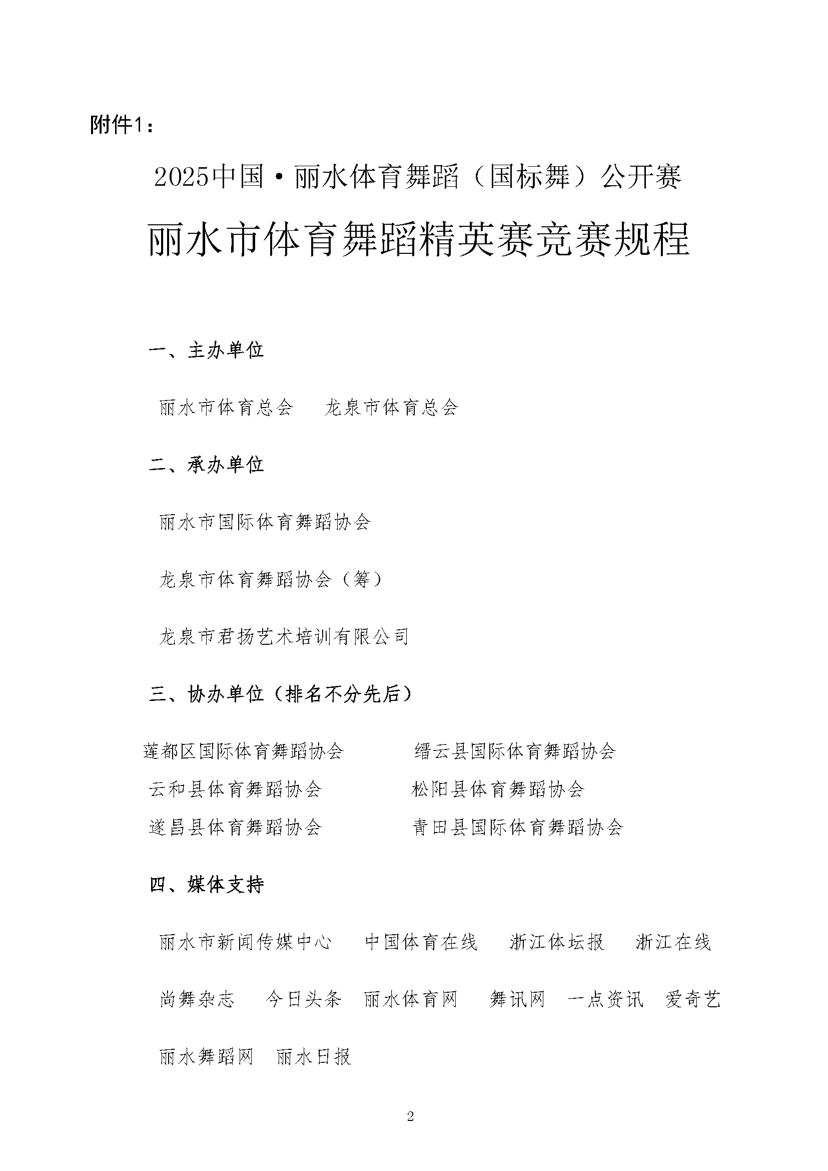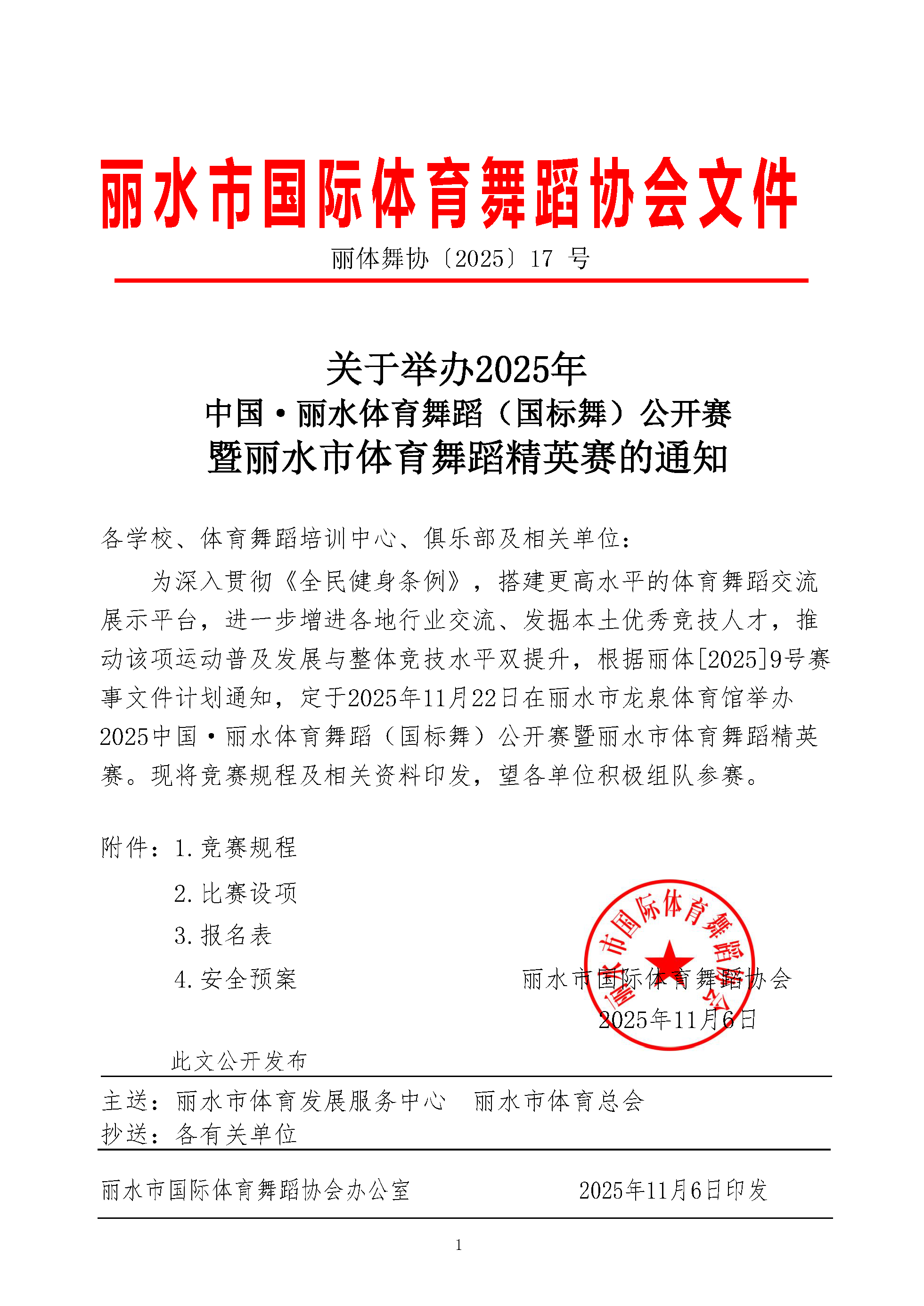 关于举办2025年 中国·丽水体育舞蹈(国标舞)公开赛 暨丽水市体育舞蹈精英赛的通知 发表评论 / 通知公告 / 作者: 丽水市国际体育舞蹈协会 附件1:竞赛规程 附件2:比赛设项附件3:报名表附件4:安全预案