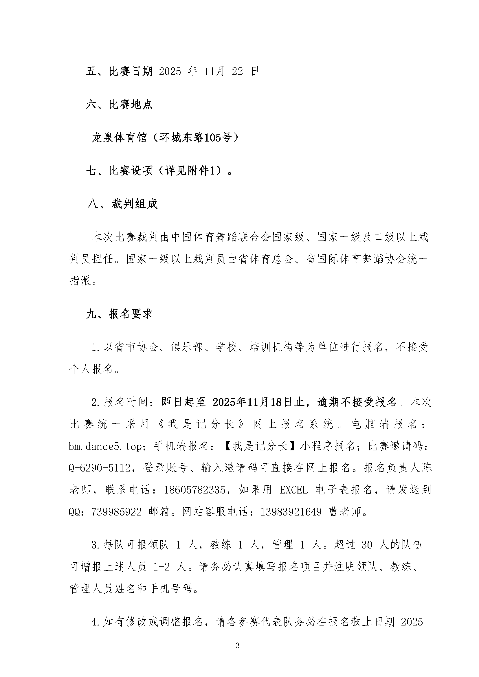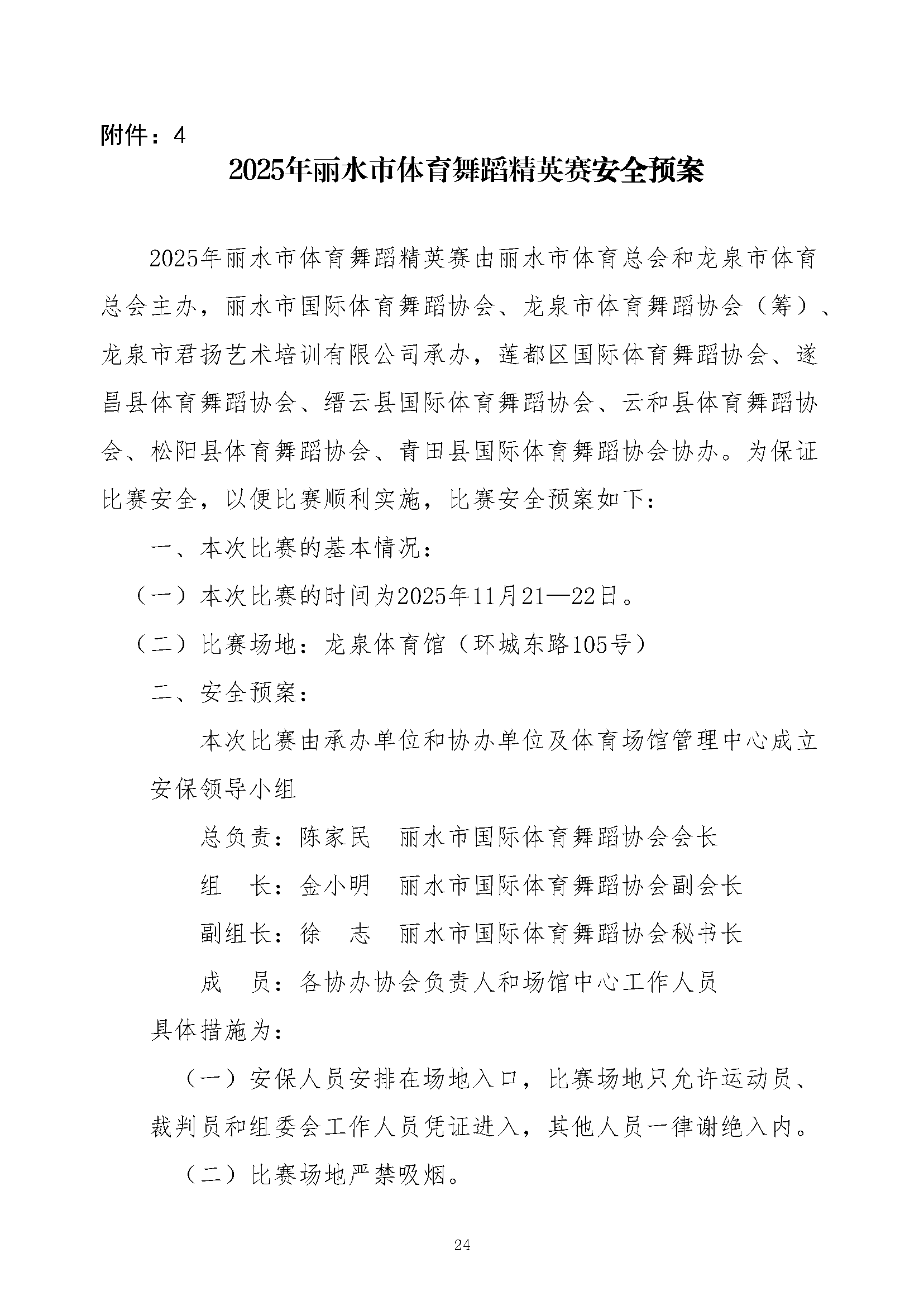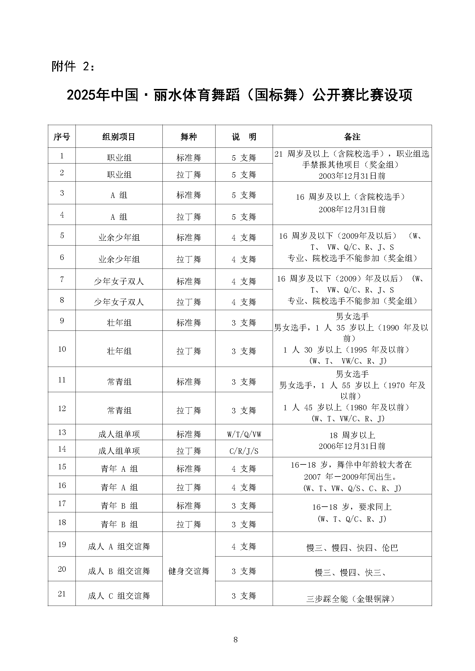 关于举办2025年 中国·丽水体育舞蹈(国标舞)公开赛 暨丽水市体育舞蹈精英赛的通知 发表评论 / 通知公告 / 作者: 丽水市国际体育舞蹈协会 附件1:竞赛规程 附件2:比赛设项附件3:报名表附件4:安全预案