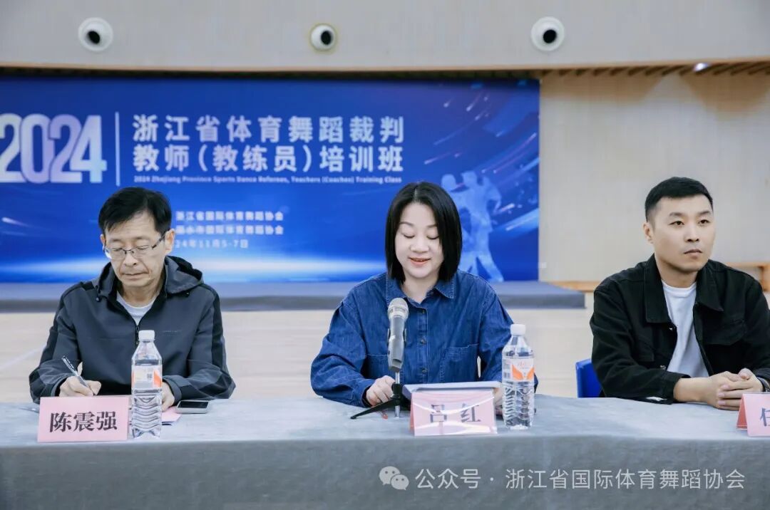 浙江省国际体育舞蹈协会秘书长吕红作了重要讲话,提出裁判、教师是体育舞蹈事业发展重要的支撑力量,对专业素养、教学竞技水平提出了更高需求,对学员们促进浙江省体育舞蹈事业发展提出了希望。