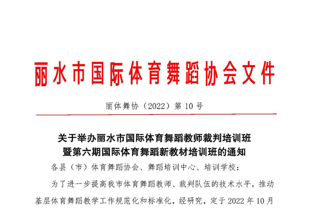 为了进一步提高我市体育舞蹈教师、裁判队伍的技术水平,推动基层体育舞蹈教学工作规范化和标准化,经研究,定于2022 年10 月5 日至10 月7 日举办2022 年丽水市国际体育舞蹈教师、裁判培训班暨丽水市第六期体育舞蹈新教材培训班。