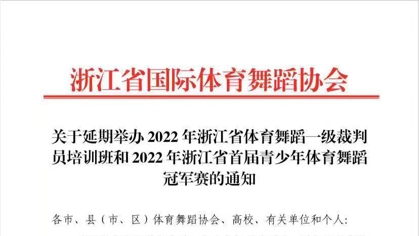 关于延期举办2022年浙江省体育舞蹈一级裁判员和2022年浙江省首届青少年体育舞蹈冠军赛的通知